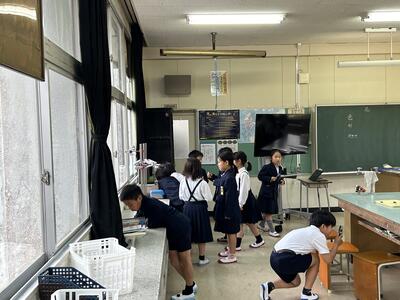 1年生は図書室の本を借り、5年生は社会科の学習で地球儀を用いて他国までの距離調べ。3年生は理科の学習で虫眼鏡を使い学んでいました。