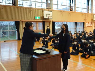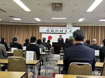 天草市の教職員感謝状贈呈式が本日市民センターで行われました。本校から田尻欣子先生が表彰されました。おめでとうございます!長きに渡り天草市の教育振興貢献に感謝の意が馬場市長より述べられました。