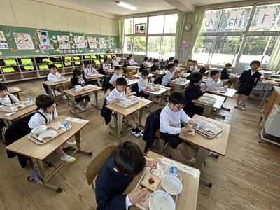 今日は給食記念週間の一環として、天草市教育委員会から平道教育委員様にご来校いただき、5年生と会食していただきました。