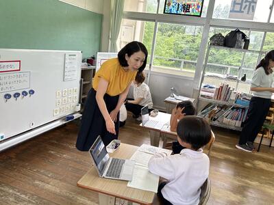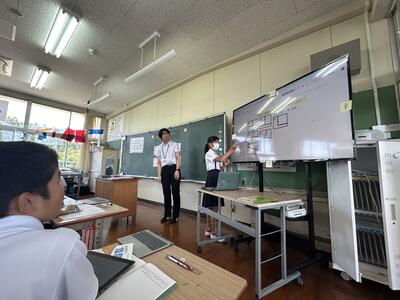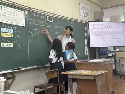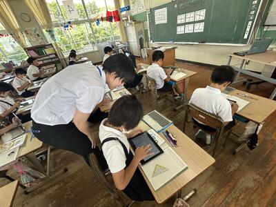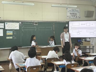5月から1か月に渡り教育実習を本校で行ってくださいました本校卒業生の札本先生(明瀬地区)がいよいよ金曜日で実習の終了を迎えられます。本日、実習のまとめとして、算数の研究授業をなさいました。
