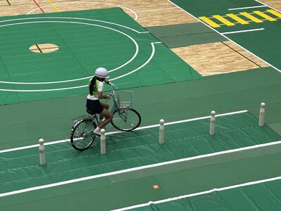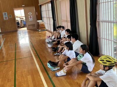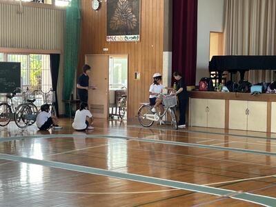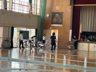 今日は3学年ずつに分かれて交通教室を行いました。昨年度も交通教室や自転車部でお世話になった交通安全教会の方々が講師としていらっしゃいました。また川本自転車屋さんが持参いただいた全ての自転車の点検もしてくださいました。