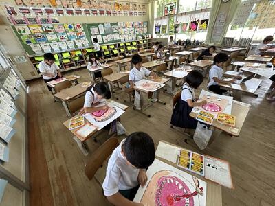 本校では、6月に自分自身の歯の健康について考えています。今日は4年生は歯の染め出しをして、歯磨きの状況を振り返り、また、1年生は歯を大切にするポスターにチャレンジしていました。