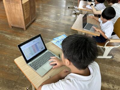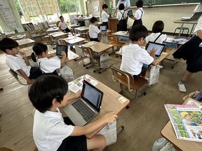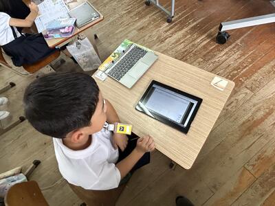 今日は1年生があさがおの観察をして、様子をタブレットに記入していました。花はいくつ、花の色は?みんな上手にまとめていました。1年生にはローマ字入力はできません。手書きしたものが変換される文字入力で頑張っていました。