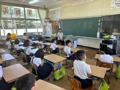 今日は1年生の道徳で、佐伊津町のすてきなものを学びました。生活科でもお世話になった地域の先生、佐藤さんをゲストティーチャーとして学びました。佐伊津には地域の方々が参加されずっと引き継がれてきたお祭りをはじめ、古くからある神社や寺院、そして美しい海、山、湧き水などの豊かな自然、たくさん教えていただきました。