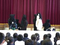 11月1日(月)、「いきいき芸術体験教室」を実施しました。今年度は、清和文楽の方々が来校され、子どもたちは「むじな」「雪女」を鑑賞しました。演目の合間には、農家の方々や清和文楽を愛されている方々が伝統を引き継いでいらっしゃること、人形は3kgのものから重いもので10kgのものがあるということ、その一体の人形を3人で動かすということなど清和文楽の歴史や人形の操作方法なども教えていただきました。