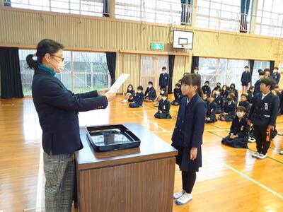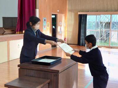 修了式ではまずは修了証を学年代表に渡しました。