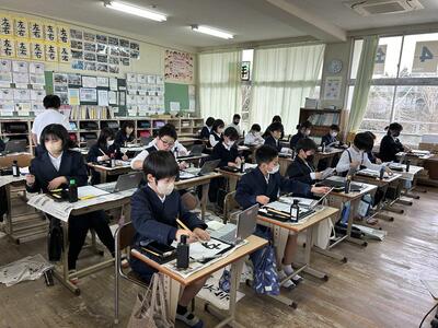 今日は午後から多くの学級が書き初めをしていました。自分の目標をそれぞれに書いていました。