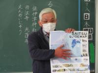 担任と学習した後、原田さんは、ご持参いただいた佐伊津の名所・旧跡等を掲載したマップを子供たちに見せながら、金ヶ丘地区の金浜城があったこと、寺の尾地区が佐伊津の小学校の発祥の地であること、在校地区に高城があったこと、各地区には地域の子供たちが元気で健やかになるよう願いを込めてまつられていることなど、たくさん佐伊津町のことを教えていただきました。