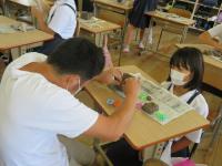9月21日(火)、5年生が「子ども作陶体験」の第2弾として、絵付けを体験しました。指導者は、6月にもお越しいただいた陶芸家の森山至さんです。子どもたちは、森山さんから説明を聞いた後、釉薬を塗り、釘を使って削って細かい模様をつけるといった作業に取り組みました。「全集中」で、出来上がりをイメージしながら、筆や釘を動かしていました。作品のできあがりが楽しみです。