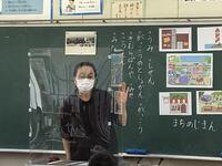 「佐伊津のいいところはね・・・。」と優しく語られます。「学校、ぶどう園、タコ釣り、延命地蔵、西法寺、光蓮寺、阿弥陀寺・・・。」写真を見せられながら、佐藤さんが紹介されるたびに、「ああ。」「知ってる!」といった声が上がりました。また、うんうんと大きくうなずく姿も見られ、子どもたちのこれまでの生活経験や知識と今日の学びが、佐藤さんによって結びつけられていました。「さいつのまちをきれいにする」「ゴミをひろいます。」といったことも述べていたたのもしい1年生です。
