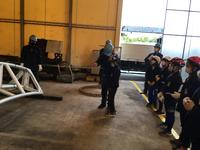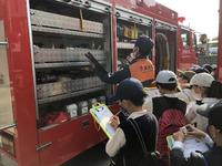 消防車を近くで見せていただいたり、格納庫にある様々な道具をみせていただきメモをたくさんとっていました。