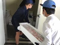 その後、子供たちは漁協の建物の中で、サワラとキスの箱詰め作業と冷蔵庫への運搬を体験させていただきました。箱に並べられた魚にラップをかけ、その上にたっぷりと氷を詰めて、冷蔵庫へ運びました。