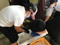 漁港では、まずサワラの水揚げ作業を見学しました。水揚げされたサワラはキラキラしていてとてもきれいでした。漁師さんが一匹一匹を丁寧に優しく取り扱っておられるのが印象的でした。