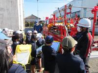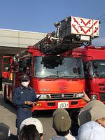 はしご車やポンプ車、拠点機能形成車(熊本では天草にしかないとのこと)など、たくさんの消防車を見せていただき、機能や働きについて教えていただきました。