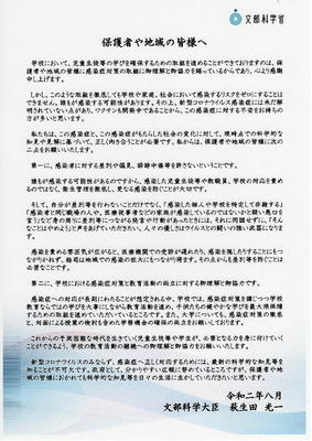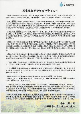 萩生田文部科学大臣より、子供たち、保護者・地域の皆様へメッセージが届きました。本日配付しています。ご一読ください。
