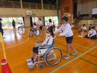 まず、車椅子体験では、車椅子の扱い方の説明を聞き、実際に押す側、乗る側に分かれて体験を行いました。