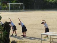 朝の時間、運動場で遊び、教室に帰る前に片付けをしていた4年生。「朝ラジ」(朝のラジオ体操)が始まってしまい、「朝の空気が気持ちいい~」と言いながら、運動場で体操をしていました。