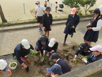 3年生の学級園です。先日いただいたキンセンカや学校で育てているノースポールの苗を植えています。手伝っているのは5年生。植え方や苗の間隔などを教えてくれています。こちらも高学年の姿、頼もしいです。