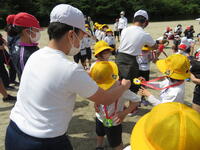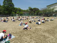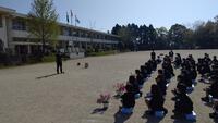今年度も新型コロナウイルス感染症拡大防止のために、運動場で行いました。(天気がよくて幸いでした)