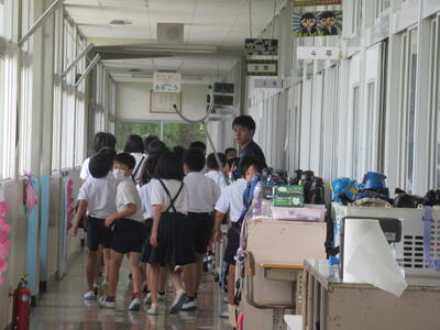 今日は校内に不審者が侵入したことを想定し避難訓練を実施しました。天草警察署の警察官のご指導をいただき計画段階から進めてきました。今日は6年生教室に侵入。近隣の学級の非常ベルを鳴らし、また避難する6年生が異常を職員室に知らせ、無事に全員が避難をすることができました。これから夏休みを迎えるに当たって、一人でいるときに声をかけられたり、車に乗せようとされたりしたときの対応についてもお話いただきました。児童を代表して6年生が今日の訓練をこれからの生活にいかしていくと、お礼の挨拶を述べました。