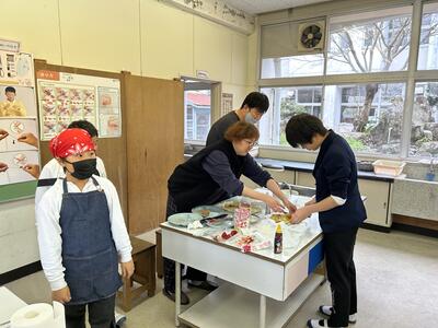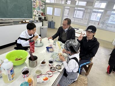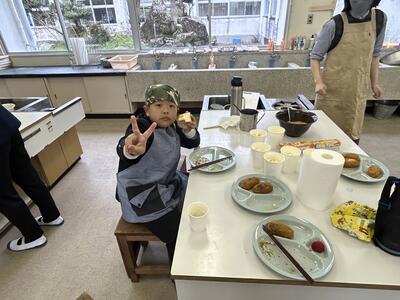 写真は親子クッキング。おいしいデザートがたくさん。ご馳走様でした!