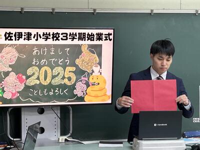 さあ、今日から3学期!3学期は学校生活で一番短い学期ではありますが、次の学年に繋がる大切な学期でもあります。2学期終業式はインフルエンザで多くの児童が欠席でしたが、今日はわずか3人の欠席。猛威を奮ったインフルエンザは沈静化の兆しでしょうか。さあ、今日から3学期!みんなで頑張りましょう。