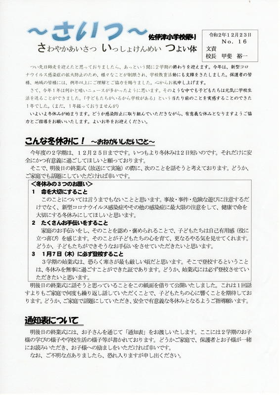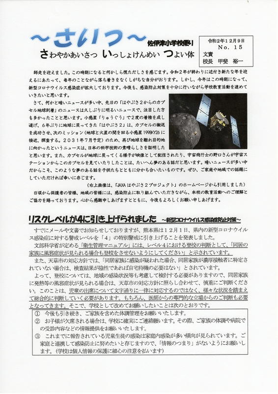 学校だよりNo.15 投稿日時 : 2020/12/09 学校サイト管理者 本日、学校だよりを配付しました。 紙面は2ページあります。 ご一読ください。 詳しくはこちら→No.15(12月9日).pdf