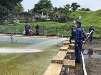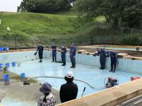 消防団の方々は、コロナ禍でなかなか訓練の機会をもうけることができなかったそうです。今回は、消防団の水出し訓練として、プールの水をくみ上げていただきました。