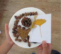 2年生に喜んでもらおうという相手意識を持って、木の実や木の葉などを使って、遊ぶものや飾るものなどを作った1年生。