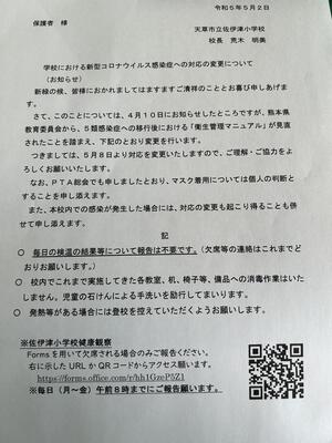 来週月曜日から朝の検温、Google formでの報告を求めません。本日文書を配付しております。ご確認ください。