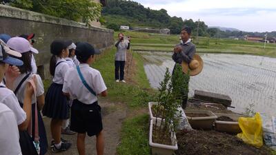 今日は1~2校時を使って、5年生が社会科の学習の一環として寺下さんのお家の田植えの見学をさせていただきました。急なお願いにもかかわらずご対応いただき、寺下さん、ありがとうございました。未経験、見るのも初めてという児童も多く、心に残るものとなったようでした。