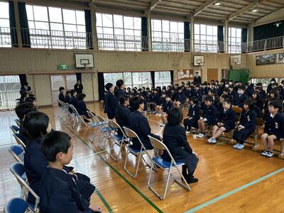 今日は現PTA会長、佐伊津小150周年実行委員長の酒田拓也様にご講話いただきました。令和7年度150周年を迎えるあたり、どのようなことをやってみたいか児童にまずは考えさせたかったこと、またそのためには佐伊津小のこれまでのあゆみやこれまでの佐伊津小の児童がどのように頑張ってきたのかをきちんと知る必要があり、佐伊津小学校の卒業生である酒田会長にご講話をお願いしました。