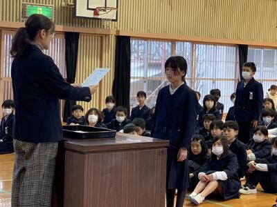 今日は佐伊津小学校199日の令和6年度の締めくくり、修了式でした。みんな、よく頑張りました。次の学年への進級です。おめでとう!修了式では代表へ修了証が渡されました。各学級では担任から一人一人へ渡されました。