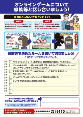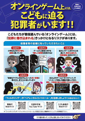 こうした情勢を踏まえ、警察庁では、こどもがオンラインゲームをきっかけとして犯罪に巻き込まれるリスクや、リスクを踏まえた家庭内でのルール作り等について、こどもやその保護者等に周知するため、広報啓発資料を作成いたしました。ご家庭での注意喚起をお願いします。