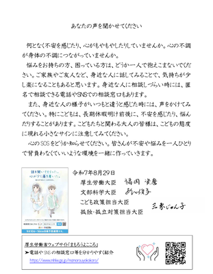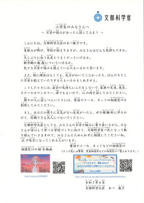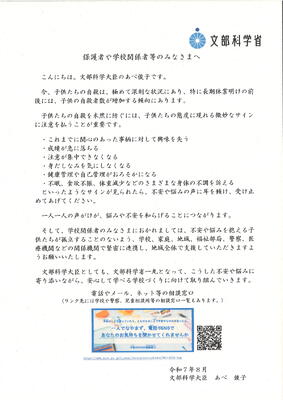 長期休業明けに向けた自殺予防に係る児童生徒や学生、保護者等への文部科学大臣メッセージ