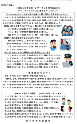 児童生徒のスマートフォンや1人1台端末等の安全利用について、県教育委員会から啓発資料が届きました。ご一読ください。