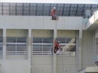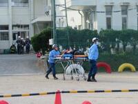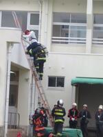 場所を移動して、消防士さんと消防団の方々の訓練を見学します。地震による火災発生。逃げ遅れた人の救出と搬送。消防士さんが降下しています。
