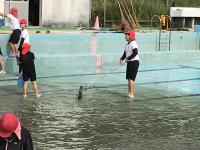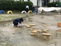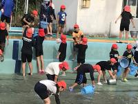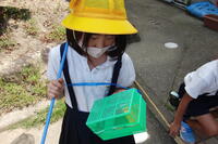 中庭を眺めてみると、「カニ、カニ、カニ!」と声がします。見てみると、1年生の子どもたちが、カニ探しに夢中です。「校長先生、いっぱいつかまえました。」とバケツを見せてくれました。「あれ、2匹しかいないよ。」と言うと、「逃げられたんです。」と、バケツから逃げ出したカニをさらに追いかけています。捕まえたカニは、昼休みが終わると逃がしてあげるそうです。優しい子どもたちです。