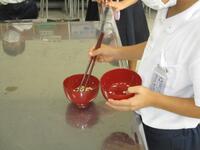毎年、保健給食委員会の企画で、「豆つかみ大会」を行っています。本日は、1年生が挑戦しました。「校長先生、9個つかめたよ。」「私は6個だった。」など、頑張ったことを教えてくれました。会食のマナーとしても、箸の持ち方は重要だと考えます。粘り強く練習しながら、正しい持ち方を身につけていってほしいと思います。