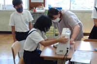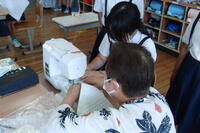 この学習に入ってから、地域学校協働活動推進員の方にもご協力いただいています。本日は、学習ボランティアの方にも協力していただき、子どもたちの作業の支援をしていただきました。私も高学年の担任が多かったため、何度もミシンを使った授業を行ってきましたが、なかなかうまくいかなかったことを覚えています。