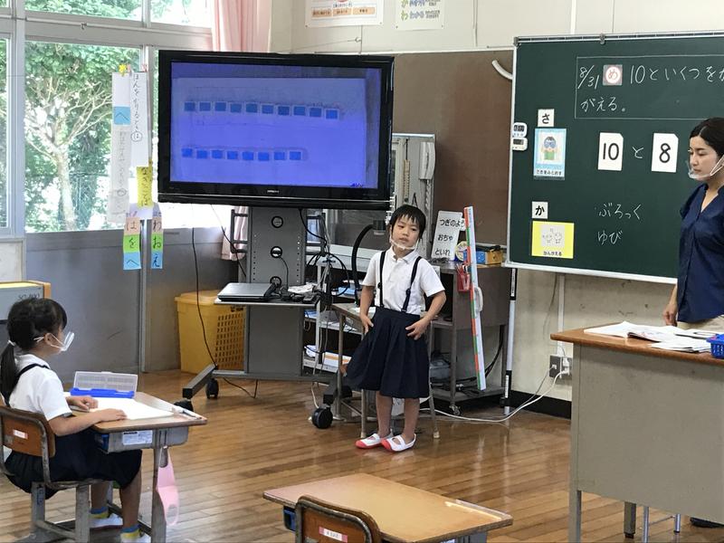 1年生の授業の様子を見に行くと、算数の授業が行われていました。「10といくつをかんがえよう」いうめあてで、10と8で?という問題に取り組んでいました。