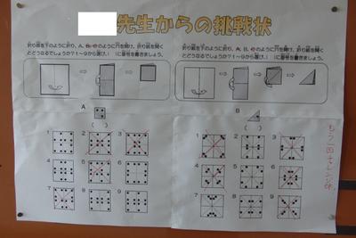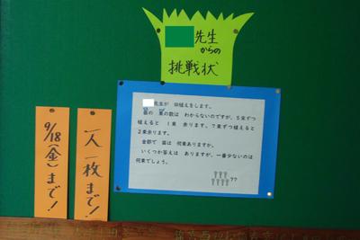 本校では、授業だけでなく日頃の学校生活の中においても子供たちの学ぶ意欲を高めていくことを目的に、定期的に「○○先生からの挑戦状!」を掲示し、主体的に難問に挑戦する取組を行っています。低・中・高学年用の問題が貼り出されますが、子供たちは喜んで取り組んでいます。