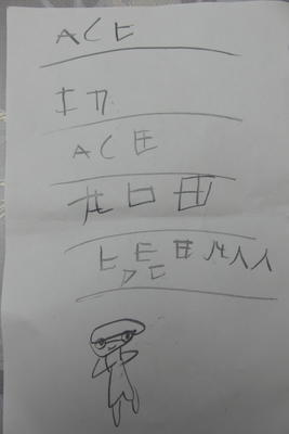 今日は、「校長先生、お絵描きしたから、一つあげるね。」と紙を渡されました。1年生担任とその絵を見ながら、「これは何だろう?」と、しばらく考え込んでしまいました。英語のようにも見えますし、カタカナのようにも見えますし・・・。一番下の絵はメガネをかけているので、私でしょう。