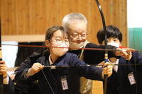 その後、協会の方々のご指導の下、実際に的に向かって一人一人が矢を射る体験をしました。礼儀作法やかけ声などを学び、的を目がけて集中する姿がありました。色々なことに気を配らなければならず、子どもたちは、ずいぶん苦戦していました。中には、的を射貫く子も出てきて、みんなで喜び合いました。