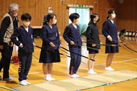昨年度の6年生は、卒業前の泡多々しくなるこの時期に、心を落ち着かせ、中学校に向けての目標を定めるという目的で「茶道」を体験しました。本年度は、弓術の礼儀作法に触れるとともに、心を整え、自らの希望に向けて気持ちを込めるという意味で、この四半的体験を行いました。