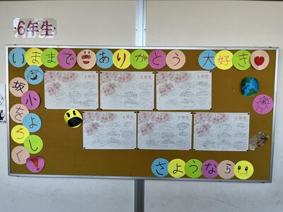 現在、6年生の掲示板には、他の学年の子どもたちに向けての感謝のメッセージが掲示されています。「卒業する6年生へ」というメッセージはよく見かけますが、6年生から在校生に向けてのメッセージは、なかなか見ることが出来ないかもしれません。そのメッセージを読むと、「鬼ごっこを一緒にしてくれたね。ありがとう。」や「次の学年では委員会が始まりますね。がんばってください。」、「一緒にたくさんお話をしたね。とても楽しかったよ。」など、6年生の下学年を思う気持ちが溢れていて、胸が熱くなります。