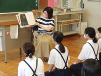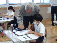 初めて毛筆に取り組む3年生には、1時間の授業の流れや道具の扱い方等、やさしく丁寧に教えていただきました。子どもたちの様子を見ていましたが、本当に意欲的に取り組んでいました。6年生は、「きずな」というひらがなを書いたのですが、ひらがなの起こりや筆の流れの理由についても話していただきました。