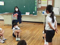 本年度も読書推進ボランティアグループ「たんぽぽホール」の方々をお招きし、お話会を実施しました。新型コロナウイルス感染症対策を図った上で、ホールに1年生から4年生まで集まり、大型紙芝居やお話のリズムに合わせ体を動かした遊びで楽しみました。「たんぽぽホール」の方々も子どもたちと交流できることを楽しみにしておられた様子で、色々な準備をしてこられていました。
