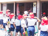 「大師山へ避難してください。」の放送があり、すべての児童が避難場所に集合するまでに要した時間は、5分21秒でした。子どもたちに対して、「5分21秒は、速かったと思いますか?」と尋ねると、みんながまだ速く避難できると答えていました。それぞれが自分なりの課題を考えていたのでしょう。