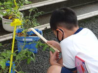 台風対策のため、低学年の子どもたちが育てているアサガオやミニトマトは室内に入れていましたが、登校するとすぐに外に並べ、いつものように水かけをする姿が見られました。1年生の子が、「朝ご飯ですよ。」とアサガオに声をかけながら水をかけている様子が何とも微笑ましく、その素直に心に感動しました。